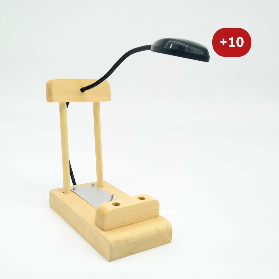 Jouw oogappel krijgt inzicht in de weg die het hout in de box heeft afgelegd en hij/zij ontdekt het mysterie achter elektriciteit. Aan de hand van de duidelijke handleiding en instructievideo ontwerpen ze stap hun ledlamp én leren ze zelf solderen*. Klaar? Dan gaan ze aan de slag met verf, stift, vernis ... om er een uniek exemplaar van te maken.